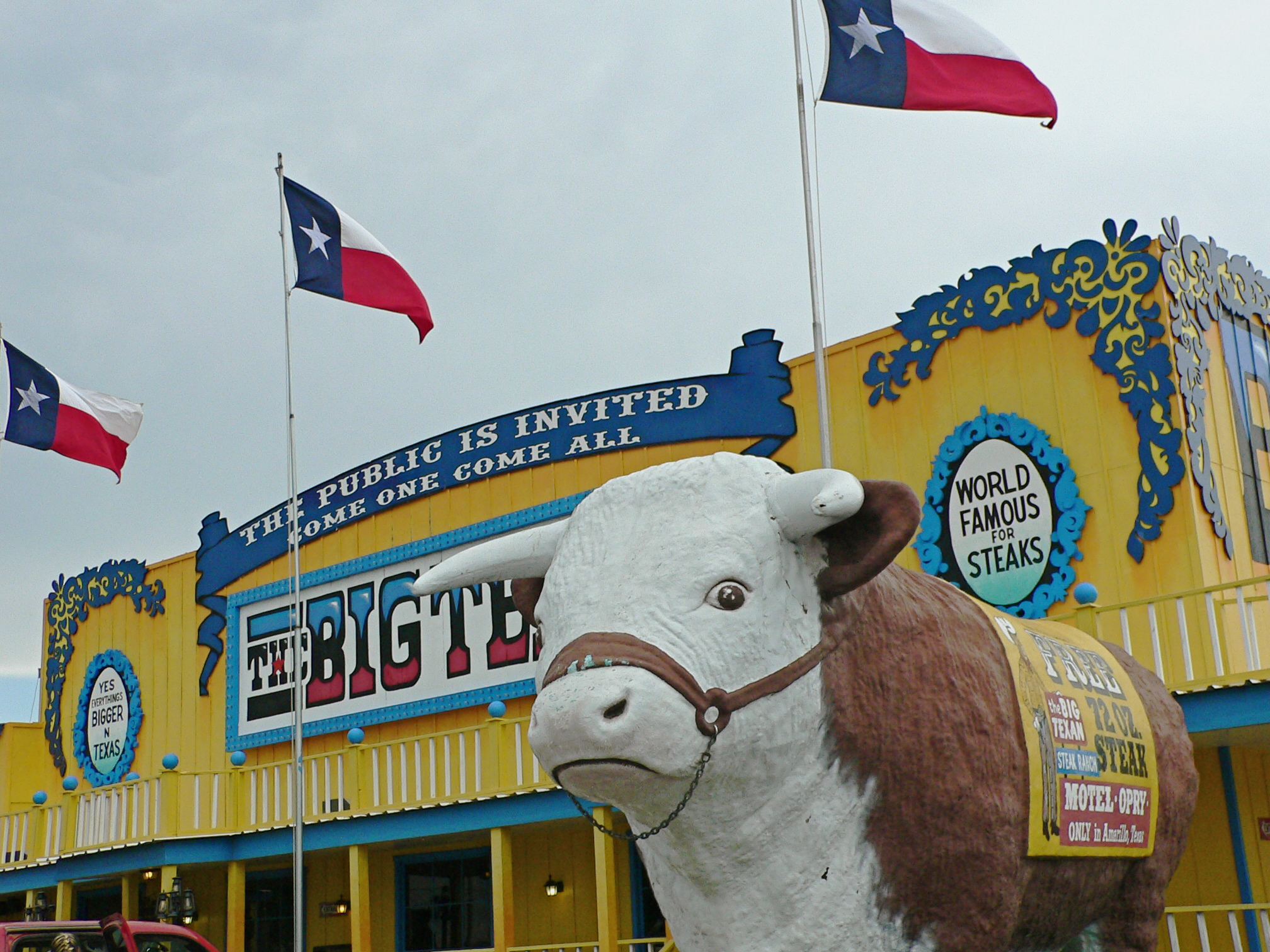 And finally in Texas, The giant steer outside The Big Texan restaurant in Amarillo, Texas, where if you eat the 72 ounce steak, appetizer, baked potato, salad, roll and dessert you get it for free. The day we stopped in a 28 year old man, weighing in at 450 pounds had finished the meal in 35 minutes. His comment: “Free always tastes better.” I couldn’t finish that meal in a week.