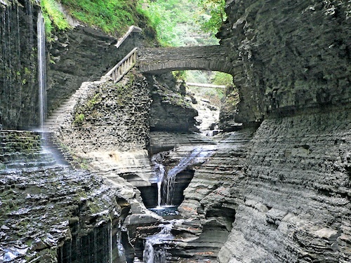 It’s a three mile trail, has about 800 steps, and winds its way through dark spiraling tunnels cut into the cliffs. It is a world of undulating walls of stone, mortared bridges, natural sculptures and 19 waterfalls. Hubby and I hiked it early before the crowds arrived. While my memories of our trips there in the early 70’s were a little purple hazy, it did not seem to have changed much. The walks were now paved, but it still lived up to its reputation as one of the most photogenic spots in New York State.