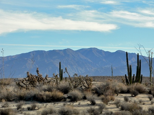 Hubby prepared for today’s anticipated white-knuckle driving with half a Zanex. We left the boulders of Catavina, entered a small mountain pass and headed across a high mesa that is a remnant of a dry lakebed. The roads are 9.5 feet wide and the RV is 8.5 feet wide so there is little margin for error when we encounter passing traffic. We go slowly, give the 18-wheelers as much room as we can as they speed by and pray for the best. One rig lost a mirror when a truck passed too close; another had a near miss but no damage. There was no mention of this in the brochure.