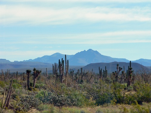 We climbed in elevation as we headed east to the Gulf coast. We passed Volcan las Tres Virgenes, an extinct volcano, and then we began to descend back down to sea level through Devils grade. Devils grade is the worst mountain section, a steep curving decline down off the mountains to the Sea of Cortez. The descent was made scarier when we had to pass an 18-wheeler coming up the grade. The caravan leaders kept us posted via CB radio about oncoming traffic so we could slow down (or stop) and give them room to pass. There were a number of crosses on the side of the road marking spots where others failed to make it. Hubby, who was either was so relaxed with his half a Zanax or totally getting used to this driving, said it wasn’t as bad as he expected.