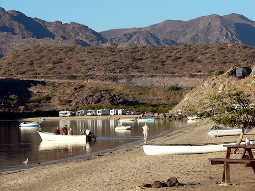 As we scattered along the roadside for a brief break near Santa Rosalita, our oil light came on. We were down a quart, so we added some oil and hoped there wasn’t a leak or some bigger problem. Our camp for the night was Playa Santispac. The camp is right on the Bahia Conception and is a beautiful place. It is dry camping, no water or electric hook-ups, so it doesn’t take us long to get settled. Despite the size of the camp Bill has us all parked tightly together in one section near the back. He explained it will be easier for us all to line up for our start in the morning if we are now spread out all over the place. We walked the beach, had some beers, talked to some of the others campers and chilled out until dinner. Some locals came through camp selling blankets, trinkets and fresh shrimp. This is a spot we would have liked to stay longer, but with the caravan we move on their schedule. We are told we stop here again on the way back.