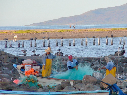 We spend our free day waiting for an oil change. We listened to a talk by a tour guide about the history of the mission in town and Loreto in general. We decided to take the trip up into the mountains to Mission Javier when we pass back through Loreto on our way back. We did laundry, had lunch, worked on the computer, watched some fisherman on the beach, but, still no mechanic. The manager kept saying they would be there. When it was time for him to go off duty he told us to hang tight, went into town, and by five-thirty he had two mechanics there with oil and a filter. We were relieved that the problem was fixed, but we never got into town. Fortunately, we will be returning this way again, so we’ll see Loreto on the return trip.