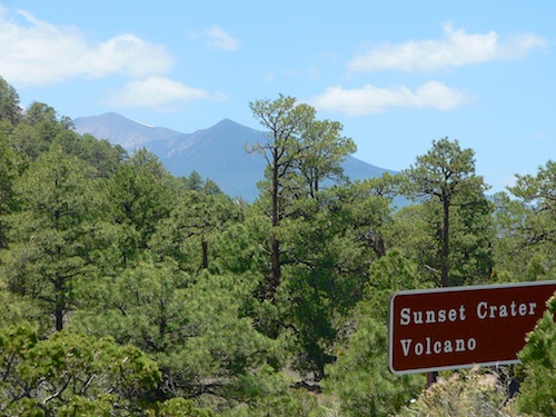 It is the 4th of July and the RV park is having a pot luck and entertainment later in the day. Having already toured the town of Flagstaff and seen the Lowell Observatory, we decided to spend the holiday exploring the countryside. First stop, Sunset Crater National Monument, about 15 miles north of Flagstaff. This crater is in the eastern part of the San Francisco volcanic field, and is fairly young, having erupted only 800 or so years ago. The lava flows and cinder fields are still there, and covered a pretty wide 810 square miles. The crater got its name from the rusty brown patches of rock spatter around the top of the cone. In the right sunlight the rocks glow bright red. This area forms the western border of the Painted Desert and there were great vistas of this colorful expanse that we had just explored a few days before.