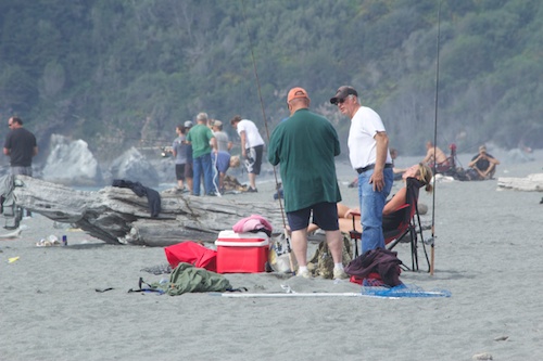 We arrived at Klamath River RV and settled in. Once again we encountered Hughes Communication for internet and it would not talk to the Apple laptop, but the IPAD was fine. We were right on the Klamath River and the manager suggested we drive down to the mouth of the river and watch the salmon fishing scene going on there. It was a short drive but we had to find a parking space pretty far down the road because the place was packed with cars. We chatted with a women heading to the river to fish and she showed us the way: up a trail, over some rocks, through the woods and finally ending up at a beach where the river cut through to the ocean. Both sides of the river were packed with anglers looking for that big Chinook.